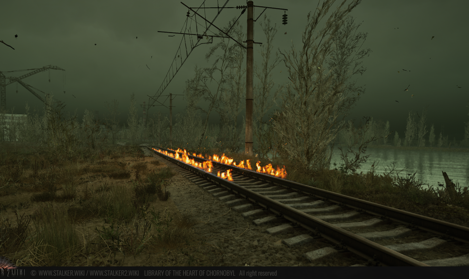 На Градирнях, за цехом великовузлової збірки, розташовані іржаві залізничні колії, що йдуть у далечінь. Вони охоплені рівними язиками вогню посеред пустки. Здається, що це стара добра аномалія «Жарка», та підійшовши ближче, бачиш слід наступника DeLorean — потяга часу.